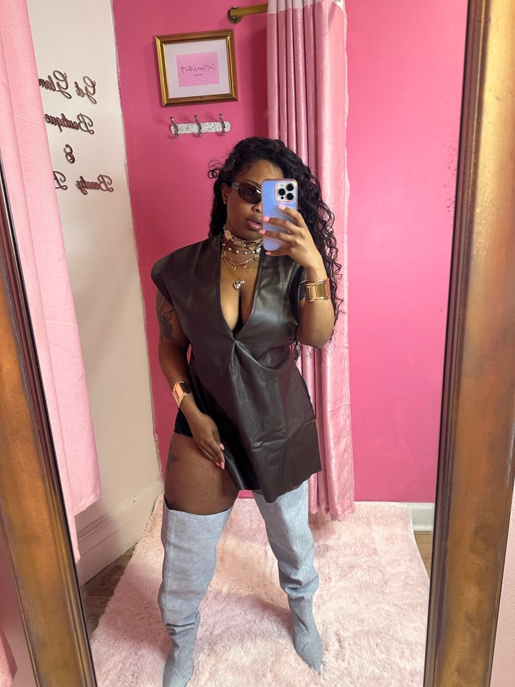 Make a bold statement with our Edgy Luxe Leather Oversized Top. Crafted from smooth, high-quality faux leather, this top features daring cut-out sides that add a touch of rebellious flair. The deep V-cut front creates a flattering neckline that pairs perfectly with your favorite jeans or skirts. Its oversized fit gives you a relaxed yet striking silhouette — perfect for nights out or when you want to elevate your everyday look.