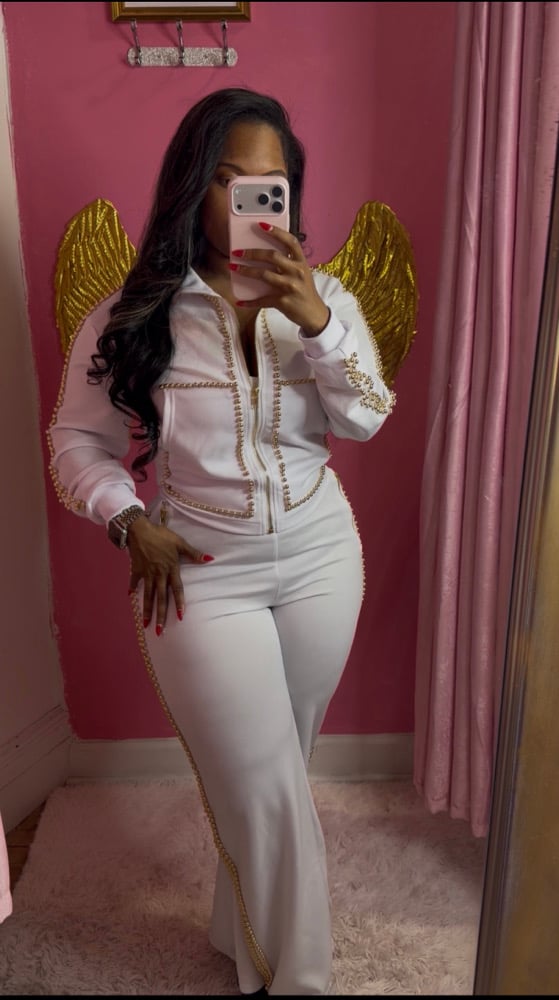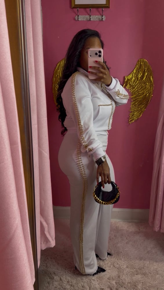 Step into effortless luxury with our White Tracksuit featuring elegant gold pearl trimming—where comfort meets statement style. This set is designed to turn heads while keeping you cozy, polished, and unapologetically chic.