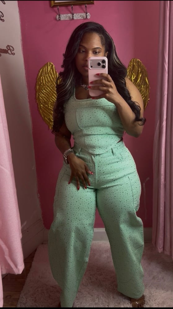 Step into statement style with our mint green denim barrel pants set — where edgy meets glam. This eye-catching set features structured barrel-leg pants paired with a matching top, elevated with shimmering crystal embellishments that catch the light from every angle. The soft mint hue gives a fresh, luxe vibe while the unique silhouette keeps your look bold and unforgettable.